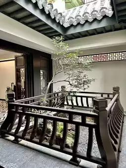 The Chinese-style patio and blue-and-white porcelain elements are full of retro vibes 🏺