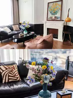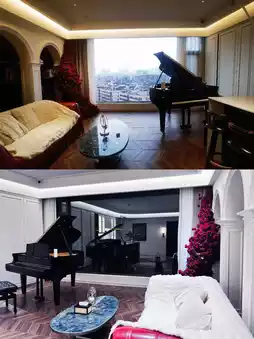 The common area features a piano, sofas, floor-to-ceiling windows, a capsule coffee machine, and a super photogenic rose wall 🥀. Taking photos here is an absolute must!