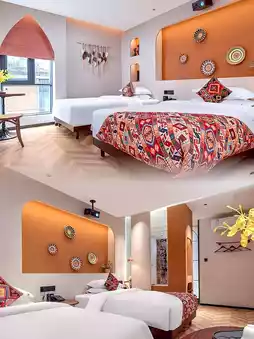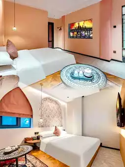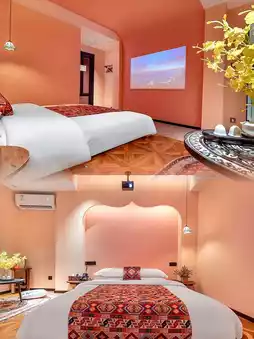 The rooms blend Moroccan aesthetics with ethnic minority elements, creating a unique pink-toned, girly vibe. Spacious and bright, the tatami beds are soft and comfortable, with meticulous attention to detail. The bathrooms are well-equipped with separate wet and dry areas, offering a top-notch stay.