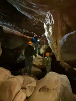 This is a tour where you can borrow a safety helmet and a headlamp. You can crawl between narrow rocks, walk on slippery rocks using ropes, and slide down while crouching. Tough + thrilling