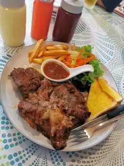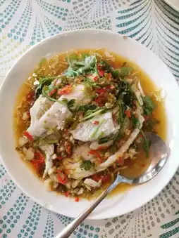 We ordered both styles: Steamed sea bass with lime, shrimp in fish sauce, and pork steak with black pepper sauce. The food was very delicious, just as my friend said. Steamed sea bass with lime and shrimp in fish sauce were very spicy and delicious. As for the pork steak, I was very impressed. I liked it very much. It was very delicious. The pork pieces were very large, soft, and not tough at all. The sauce was also very delicious. No wonder I saw almost every table ordering it.
