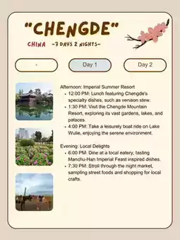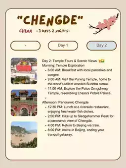 • 1:30 PM: Visit the Chengde Mountain Resort, exploring its vast gardens, lakes, and palaces.