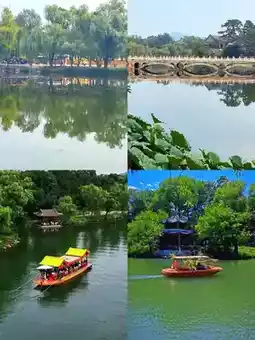 2. Lake Area: Pass through Xiuyun Gate and cross Wanhua Songfeng Bridge to reach the lake area. Zhijing Yundi was built to imitate the Su Causeway of West Lake. It is winding and meandering. Strolling on it, you will feel as if you are in a water town in southern China. Yan Yu Lou is the location of Shufangzhai in the TV series *Princess Pearl*. The lake in front of the building is rippling with blue waves, and the ancient pines behind the building are lush, full of romantic atmosphere. Shuixin Pavilion is located between Yinhu Lake and Xiahu Lake. With its soaring eaves and open structure, it is a great place to take pictures. You can take very beautiful symmetrical reflection photos here.