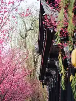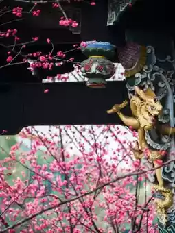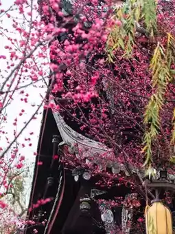 The poetic atmosphere of "listening to the spring rain in the small building" still lingers by Xue Tao Well, and now visitors can walk slowly along the mossy path with umbrellas or sit on the beauty's couch and watch the river water break the plum blossom shadows. Suddenly, a painted boat breaks through the misty waves, carrying a cabin full of fallen flowers downstream, as if traveling through a thousand years of time. The century-old plum trees in the cultural relics area are best for boiling snow and brewing tea, while the green calyx plum tree at the corner of the north gate is the perfect embodiment of the poetic scene of "the sparse shadows slant across the shallow water."