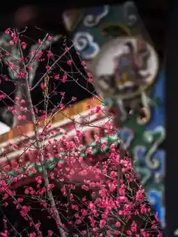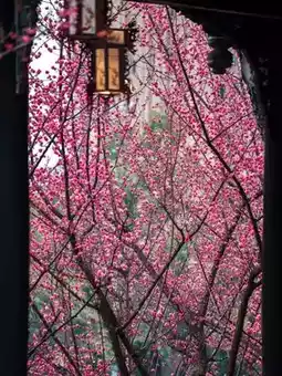 Enter through the south gate, and the fragrance of the flowers will cling to your clothes like mist. At the corner of Zhuojin Tower, you will see several red plum branches passing through the corridor, like a beautiful woman looking out the window with flowers in her hair. The ancient plum trees in front of Chongli Pavilion are the most beautiful, with their gnarled branches supporting the red flowers in the air, and the glazed eaves and the river waves complementing them. The light and shadow here are the most wonderful, with the morning sun shining on the plum branches and the evening light dyeing the flowers, and the copper bells on the eaves ringing in the wind, causing the red petals to fall on the carved railings.