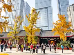 The weather in Chengdu in early winter is perfect for traveling, but the yellow ginkgo trees create a harmony between the beauty of the temple and the seemingly bleak downtown buildings.