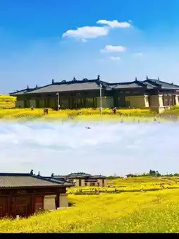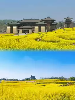 Rapeseed flowers bloom around the museum palace, giving it a classical atmosphere. The rapeseed flowers bloom on the hillside, surrounding the palace. Whether you take photos from the top of the hill or the bottom, they all look great.