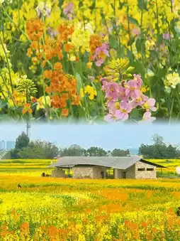 The rapeseed flower sea is large in scale, with yellow and pink rapeseed flowers, and there is a wheat field next to it.