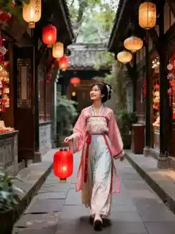 - Ancient architecture– Qing-style buildings, stone paths, red lanterns.