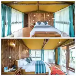 The hotel offers four themed room types: tree houses, beehives, tents, and idyllic wooden cabins, each a unique natural art gallery. Tree houses are nestled within a vibrant forest, offering lush greenery right outside your window. Beehive rooms, crafted from natural wood, feature spacious balconies with breathtaking views of a hidden floral paradise. Tent rooms resemble campsites scattered under the stars, where you can gaze at the Milky Way at night and wake up to gentle sunlight streaming through the glass curtain walls in the morning. The rooms are meticulously designed with families in mind, providing children's slippers, mini toiletries, folding clothes racks, and even thoughtfully placed bedside nightlights – a true lifesaver for parents traveling with little ones.