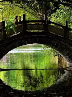 π Golden Flower Bridge hides among bamboo groves, with shimmering water below and swaying bamboo shadows all around, as if you can hear the footsteps of ancient visitors.