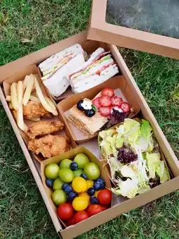 Pack fries, cakes, wings, and fruit for a picnic on the lawn—kids will love it!