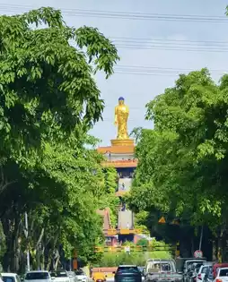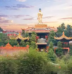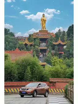 Two iconic statues stand out in particular: a towering 9.9-meter golden statue of Amitabha Buddha atop Mount Muma, gazing down at the winding Willow River below, and a 7-meter-high bronze statue of Guanyin holding a purification vase, radiating compassion. When sunlight pours over them, the statues shimmer with golden light, as if bathed in divine radiance. These two statues, one high and one low, create a striking visual spectacle.