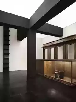 Concealed beneath towering trees lies a black metal box. The interplay of basic geometric forms and lush nature fosters a harmonious tension. Designed by Chaos Programme, this new space transforms the original structure entirely in black, dissolving spatial hierarchies to create a unified whole. The main building features a black metal cladding that envelops the irregular facade of the original structure. Precisely carved openings offer glimpses of the underlying architecture, creating a richly layered depth.
