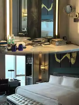 The room is decorated with a luxurious style, soft bedding accompanies your sleep, panoramic floor-to-ceiling windows offer a dazzling city night view, even the toiletries emit a high-end fragrance, details are perfect and super healing!