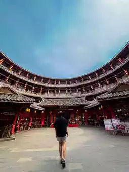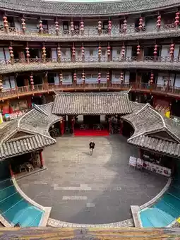 Travel Tips: Visit during the daytime to admire the architectural details, while late afternoon or sunset provides softer light and a quieter atmosphere. For photography, Wufeng Lou is best captured from the square or across nearby water, where its reflection enhances the shot. At Boke Lou, wide exterior shots highlight its tulou-inspired form, while inside, views from the upper floors are perfect for showcasing the dramatic interior design.