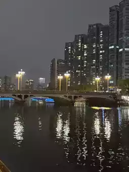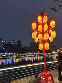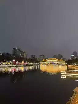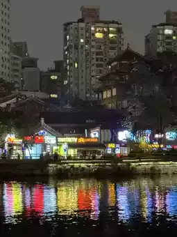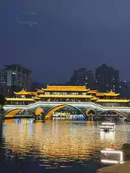 As dusk falls, the lights on both sides of the Jinjiang River gradually illuminate. At this moment, Anshun Lang Bridge bathes the water in a dazzling display of color. Its simple structure gleams with the light, resembling a golden dragon resting peacefully on the river.
