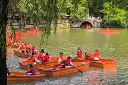 Here is a blend of everyday life and slow time. In Heming Teahouse, bamboo chairs and clear tea are paired with melon seeds and snacks, as tea drinkers leisurely savor their brew. The charm of this century-old teahouse gently spreads with the fragrance of tea; the skilled ear-cleaning masters dance lightly around your ears, offering a unique and pleasant experience of old Chengdu. The Xinhai Autumn Baolu Incident Memorial quietly stands, telling the weight of history; small boats ripple on the lake, willow branches gently brush the water, full of leisurely charm. The market bustles with crowds, lively and vibrant. The park blends tea culture, old stories, and joyful moments into this space, making every moment filled with the comfortable flavor of Chengdu.