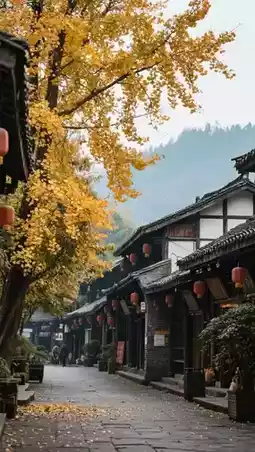 Walk along the stream through the forest, with colorful trees, waterfalls, and Taoist temples scattered around, full of autumn atmosphere.
