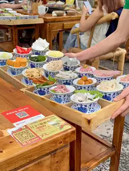 The atmosphere is lush and inviting, reminiscent of an ancient Chinese courtyard. Seating is available in both the air-conditioned area and the outdoor garden, surrounded by flowers. Perfect for a long getaway with friends or capturing beautiful photos for social media. A wide selection of ingredients are served in cute Chinese-patterned cups, including vegetables, meat, meatballs, and a variety of snacks. The mala soup is incredibly flavorful and fragrant with Chinese herbs. We recommend pairing it with a cold drink or a dessert: the adorable and delicious green panda mochi ice cream. This is another must-try when in Chengdu.