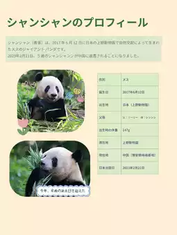 Xiang Xiang is a female giant panda born through natural mating at Ueno Zoo on June 12, 2017. Her father is Lili and her mother is Xin Xin. She was returned to China on February 21, 2023, at the age of 5.