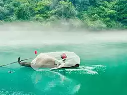 Yangtian Lake’s blue waves and sky create a picturesque scene;