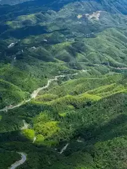 gently undulating along the mountain slopes, stretching to the horizon where it meets the blue sky.