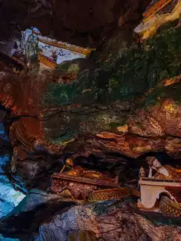 Inside the cave, stalactites and stalagmites, natural patterns resemble celestial art. Highlights include its depth and tranquility. Natural light shines through in certain sections, creating a magical atmosphere. 🔮🪨