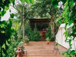 The accommodation is simply designed. We stay in a cozy tent, like we've been transported back into an old love letter. The only sound is the wind, cicadas, and the stars at night as our companions. There are no distractions, no strong phone signal to rush through, but instead, we're filled with natural signals that help us reconnect with ourselves.