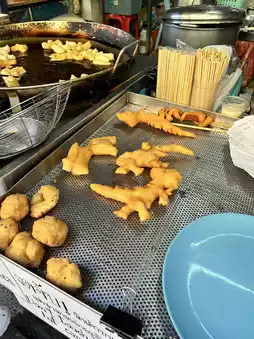 The highlight is the fried dough sticks, which are special because they are shaped into different animals. There are elephants, dinosaurs, crocodiles, frogs, and dragons.