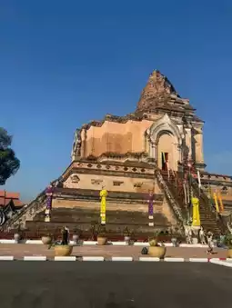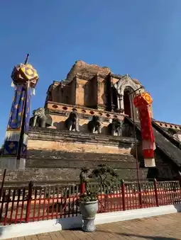 Within the ancient city of Chiang Mai, there are several large-scale temples. Besides Wat Phra Singh near the weekend night market, Wat Chedi Luang is the most popular. It combines three distinct styles of temples: Lanna, Indian, and Sri Lankan, which were later merged to form the current Wat Chedi Luang, also known as the 'Temple of the Great Stupa.' It is the most famous among the six major temples in Chiang Mai.