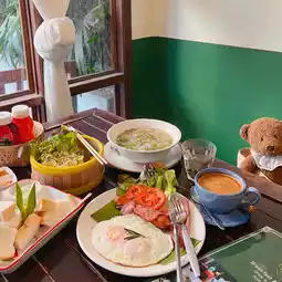 𓂃There are a variety of menus at affordable prices, including American breakfast, fried eggs, rice soup, dumplings, and kaya toast. 🍞🧈