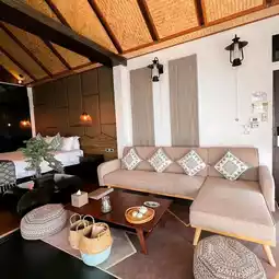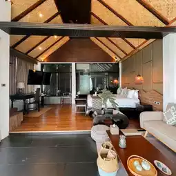 The room is very spacious, decorated in a modern Lanna style, with separate zones for a living area, bedroom, work desk, bathroom with a bathtub, and a long balcony for enjoying the view. I particularly loved the room's spaciousness and airy feel, making it feel like a homestay on a mountain, open and comfortable.