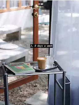 3. 8 Days a Week This cafe is located near the canal of CMU and is decorated in a simple but stylish minimalist style. There are many photo spots both inside and outside the shop. The quiet atmosphere makes it a great place to relax and enjoy a cup of coffee.
