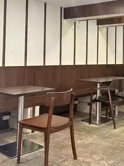 The shop is decorated with wood tones and cream colors, along with dark wood furniture