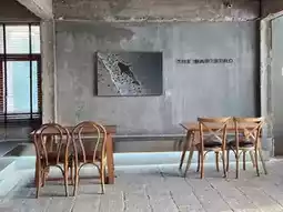 The shop is decorated in white and cement tones, with wooden furniture and large glass windows, making it airy and spacious.