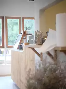 The shop is decorated cutely, comfortably, high ceiling, airy