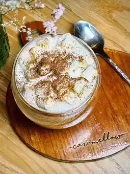 Caramellow Café has both indoor and outdoor seating areas. The café is decorated with colorful paintings and decorations. It feels like home. The outdoor area is a shady green garden with a waterfall and koi fish, creating a relaxing atmosphere. It is suitable for relaxing or taking pictures.
