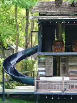 Next to the wooden cabin is a slide, adding a playful touch and serving as a great spot for memorable photos.