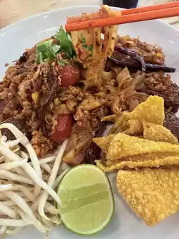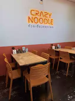 Hearing the name of the menu, I had to come and try it. Crazy Noodle or the world-class noodles is located at Sirimangklacharn Soi 13. When you enter, there is a parking lot. Many of the menus look delicious. But today, I intended to try the dry stir-fried Nam Ngiao, which uses Nam Ngiao chili paste from Pa Suk Chiang Rai. The plate is very big. The price is 80 baht. It is considered very delicious. The shop is spacious with many tables. I secretly have my eyes on many more menus. I have to come back and try them again for sure. I highly recommend it. If anyone comes to Chiang Mai, you shouldn't miss it.