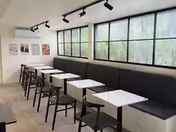 Wooden floors, white walls, simple wooden tables, few pieces of furniture, but well-arranged. There are both chill-out areas by the window, with just the right amount of natural light! Including an area where you can clearly see the coffee roasting machine, which is raw and cool 🔥🫘