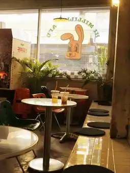 The orange-based signboard, chairs, and rabbit logo, as well as the interior of the store are very cute.