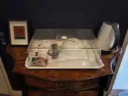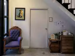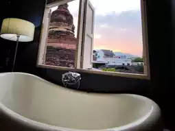 Naptel Changmoi is a small accommodation with only 4 rooms, 2 rooms per floor. The Blue Room is located on the upper floor, on the right-hand side, and is often featured in promotional materials for this property. Upon opening the door, you'll see an old pagoda. This accommodation operates on a self-check-in and check-out system. After booking, you can add the property’s Line account or call to request the front door code and the key box code. The building is over 100 years old, so the second floor tends to creak as you walk. The Blue Room features a large, comfortable bed with excellent air conditioning around the sleeping area. Adjacent to the bed is a balcony where you can stand and enjoy the view of the street. The bathtub area includes a vanity table and a sofa for daily use. The bathroom is divided into wet and dry zones. Amenities include shampoo, shower gel, two small bottles of drinking water, a hairdryer, dishes, and coffee-making equipment. The best lighting occurs in the evening when you can open the window to see the orange glow behind the old pagoda. This accommodation offers great value for its price.