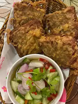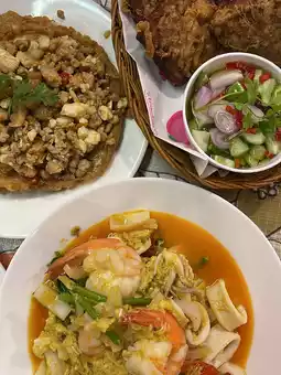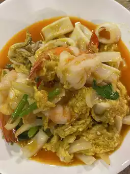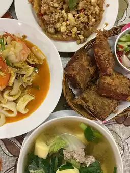 Feels like eating at Baan Mae's house. The atmosphere is warm and friendly. Today we ordered the Kai Sing menu, which is an omelet topped with minced pork stir-fried with salted eggs and pork rinds, which is a legend of this restaurant. It's really delicious. We also ordered pork bread, which is a menu that you can't miss if you come here. Plus the seafood stir-fried with curry powder, shrimp, and squid, fresh and bouncy, specially selected. Plus, the taste of the food is indescribable. And we also ordered clear soup with tofu to sip the soup, it's really good.