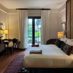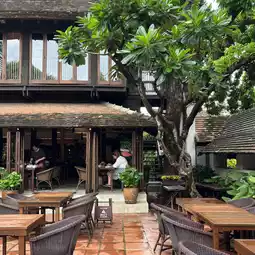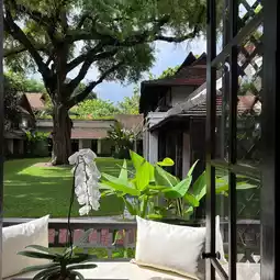 A boutique hotel in the heart of the city, featuring a large tamarind tree at its center. The serene atmosphere makes it perfect for relaxation, giving off a resort-like vibe 🛖. The hotel is located in the city center, close to many temples and near Tha Phae Gate. The entrance is adorned with bamboo arches, providing a refreshing and calming ambiance right from the start. Once inside, you'll feel the essence of Lanna culture through the architecture and decor. At the center of the property, there's a small pool 🌊 that offers a quiet and peaceful retreat, ideal for escaping the hustle and bustle.