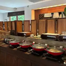 🛌 The room I stayed in was the Lanna Deluxe Room. My room was on the ground floor and had a private balcony overlooking the tamarind tree and lush greenery 🍀. The interior features dark wood materials and dim lighting, creating a cozy and inviting atmosphere. The TV is not a Smart TV, and the bathroom is equipped with a shower 🚿. The room is well-equipped with amenities, the bed is comfortable, and the breakfast buffet offers a wide variety of dishes. The dining area overlooks the pool, making for a very relaxing experience ✨.