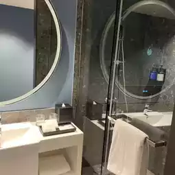 There are 4 hotel buildings and good security. To enter the guest room zone, you must use a key card. The rooms are spacious and not very big, but the beds are very soft and comfortable. The bathroom is beautiful with a mirror and LED lights.