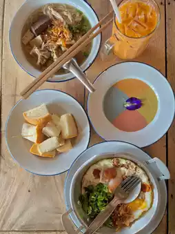 🍳 Ko Pueak Ko Dam Restaurant is a breakfast restaurant that anyone who comes must not miss checking in at this shop. The highlight of this shop is the colorful custard bread, delicious fried eggs, and delicious kuay chap!! It is a small shop, recommended to come early in the morning because there are quite a lot of people.