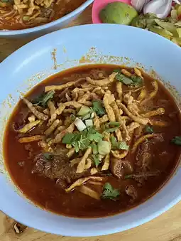 The soup is rich, the aroma of curry paste is deep but not too strong, perfectly balanced. The Khao Soi noodles are chewy and soft, served with crispy noodles on top that are fried just right, crispy but not too hard to the point of hurting your mouth. The stewed beef is very soft, easy to chew, and has no unpleasant smell. The Khao Soi Moo is soft and melts in your mouth, with the aroma of curry paste absorbed into every bite.