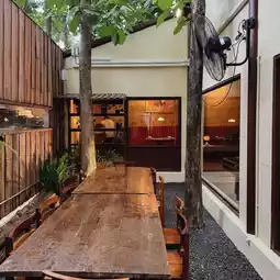 The shop is decorated in a contemporary vintage style, combining a perfect blend of Thai influences, giving a warm but still modern feeling. There are both indoor zones with high ceilings and outdoor zones under the shade of trees. Quiet atmosphere, suitable for chilling out, relaxing or working long hours with chic photo corners in every corner